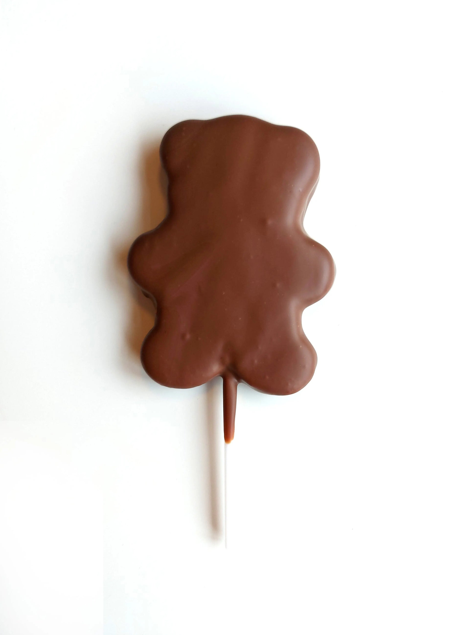 Ourson fait de guimauve vanille maison avec un enrobage chocolat noir 64% ou chocolat au lait 38%.