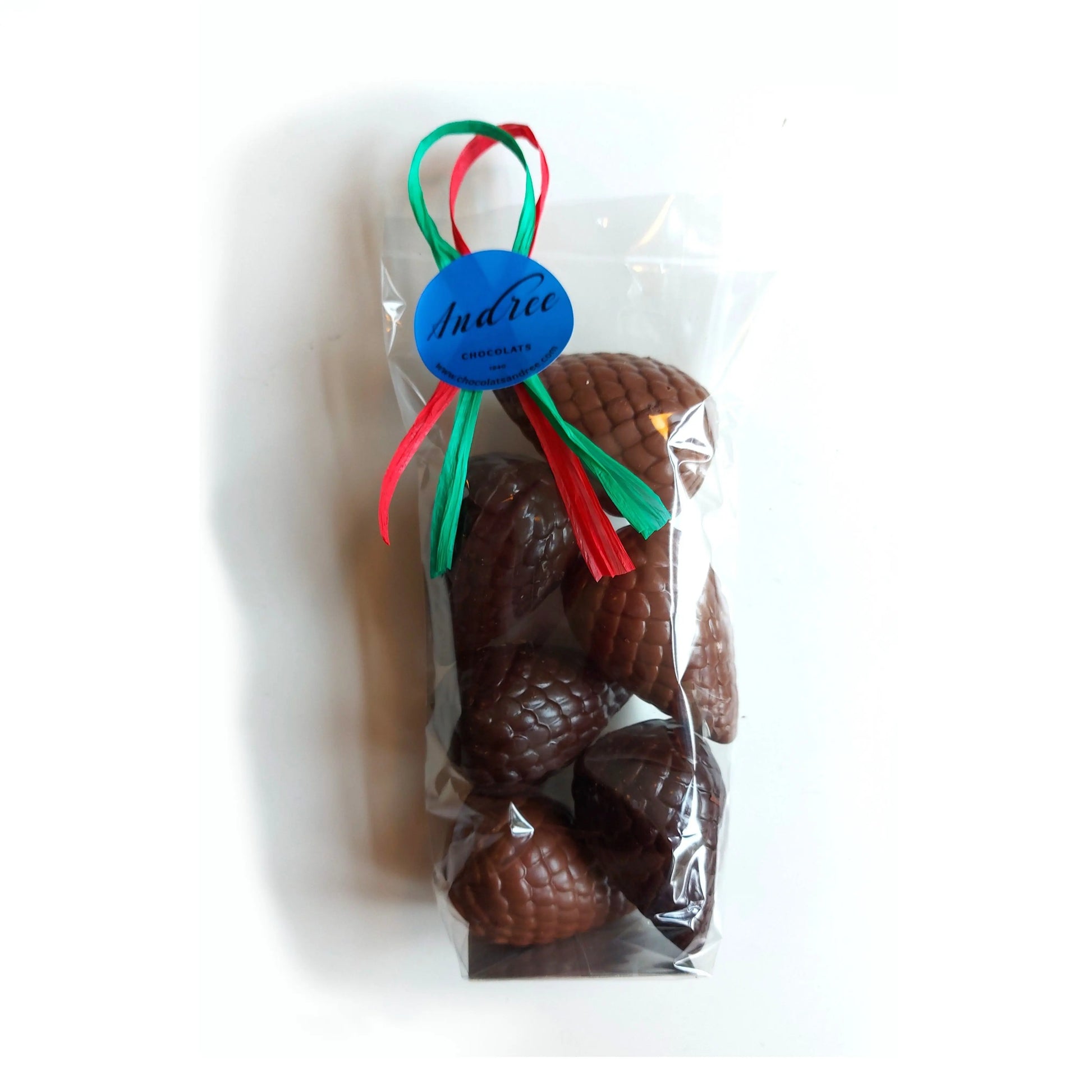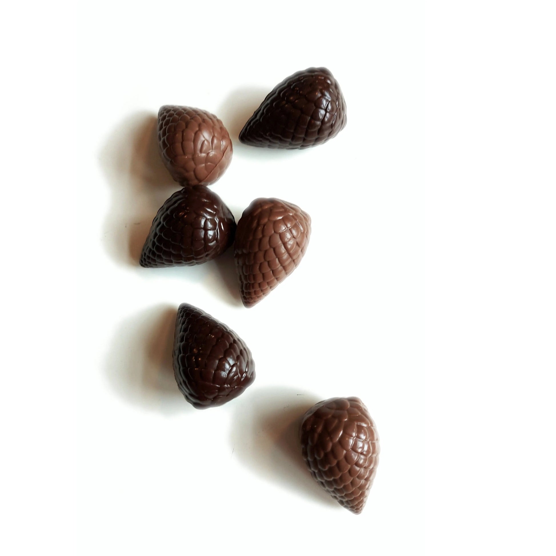 Small molded and hand-decorated cocottes. Dark and milk chocolate mix