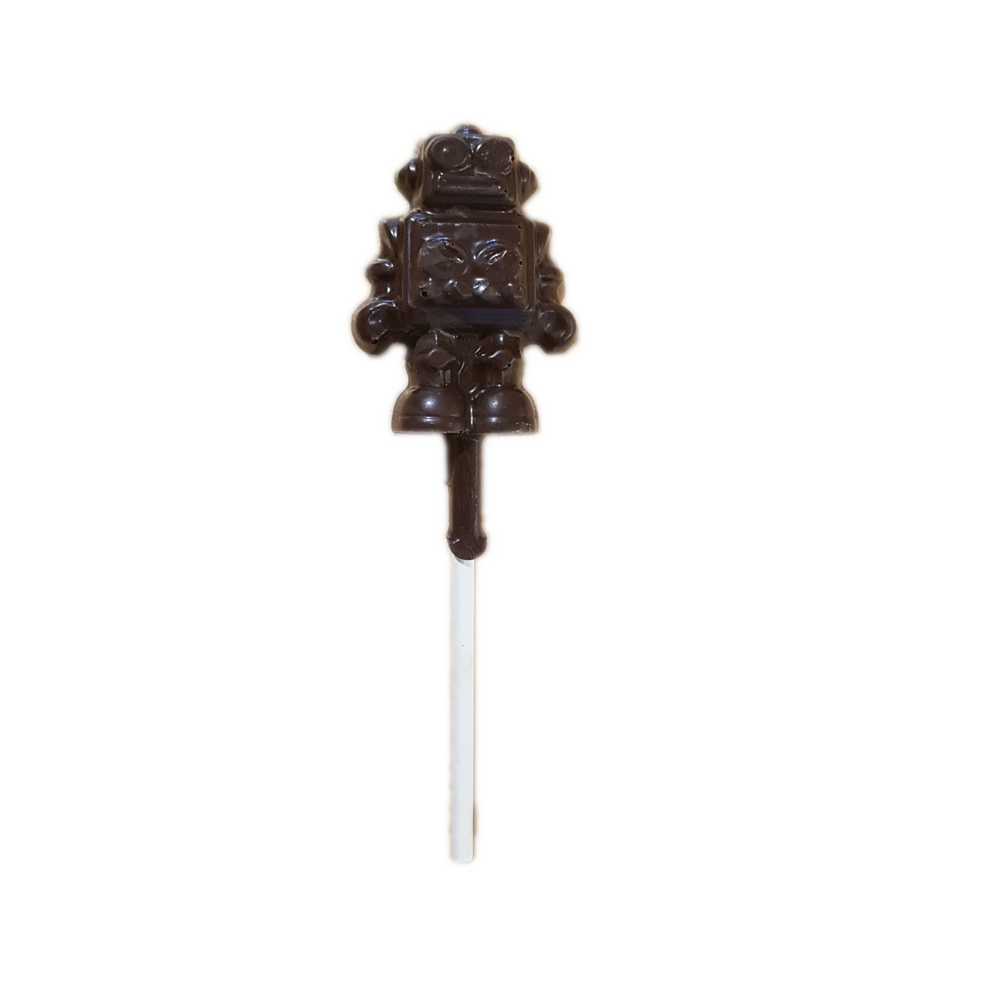 Suçon en forme de robot en chocolat noir 64% de cacao ou lait 34% de cacao.
